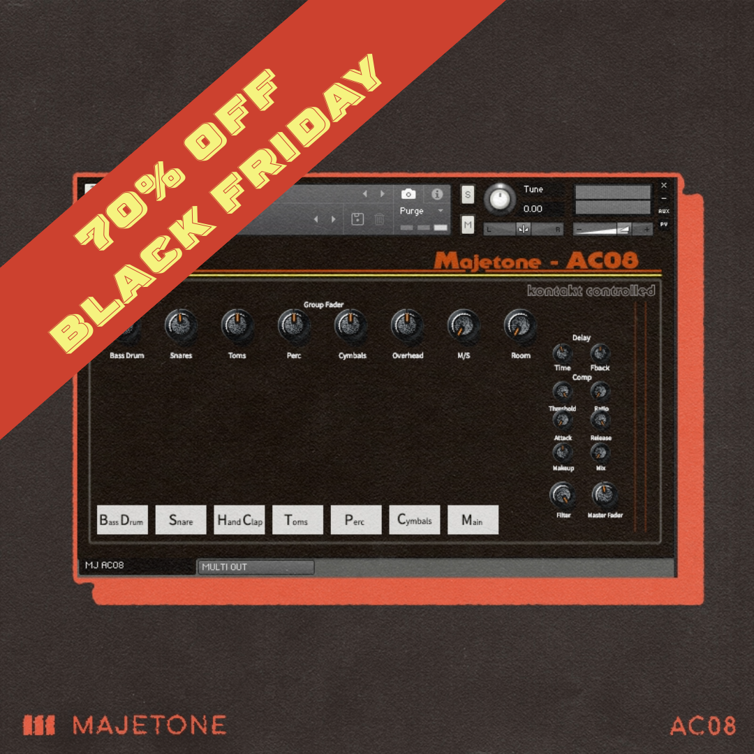 "Majetone AC08: A modern homage to the classic Roland 808, delivering a unique blend of tuned kicks, diverse snares, muffled toms and bell-like cymbals.”